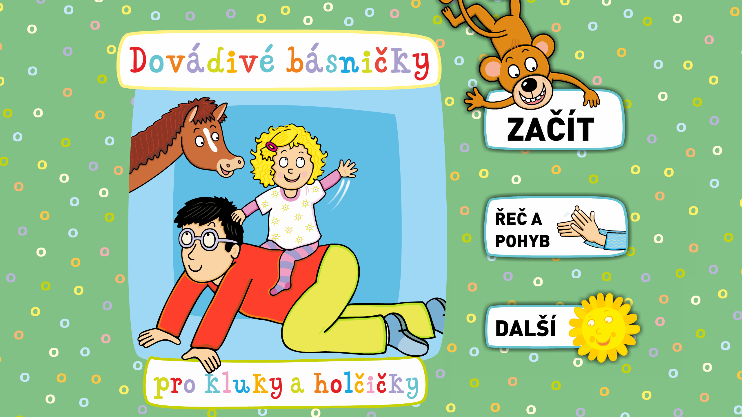V aplikaci naleznete inspirativní náměty na dovádění s vašimi dětmi. Obsahuje soubor básniček s jednoduchou hříčkou. Všechny jsou určeny pro dovádění ve dvojicích nebo v dětském kolektivu. Řadu hříček budete určitě znát. Mnohé z nich jsou generacemi prověřené, jako třeba hra na rybáře a rybky nebo na schovávanou a bavili se s nimi už naši dědové a babičky. Nové je však jejich spojení s básničkou, která dodává hříčce nový náboj a dělá ji pro děti zajímavější. Básničky jsou jednoduché, snadno zapamatovatelné a děti se při nich zdokonalují v řeči. Hlavním cílem těchto hříček je vytvoření vzájemného vztahu a pocitu blízkosti – ať už s námi dospělými nebo s ostatními dětmi. Básničky mohou pomoci Vám i dětem, aby jste se při dovádění vzájemně potkávali a společně se smáli. Nenásilnou formou včleňují dítě do dětského kolektivu. Děti se při nich učí poznávat jeden druhého, učí se vzájemnému vztahu já-ty, já-my. Přejeme hodně legrace při dovádění s dětmi.